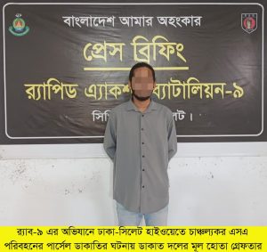 সিলেটে এস এ পরিবহনের কাভার্ড ভ্যানে ডাকাতি মামলার মূল আসামী গ্রেফতার করেছে র‍্যাব-৯